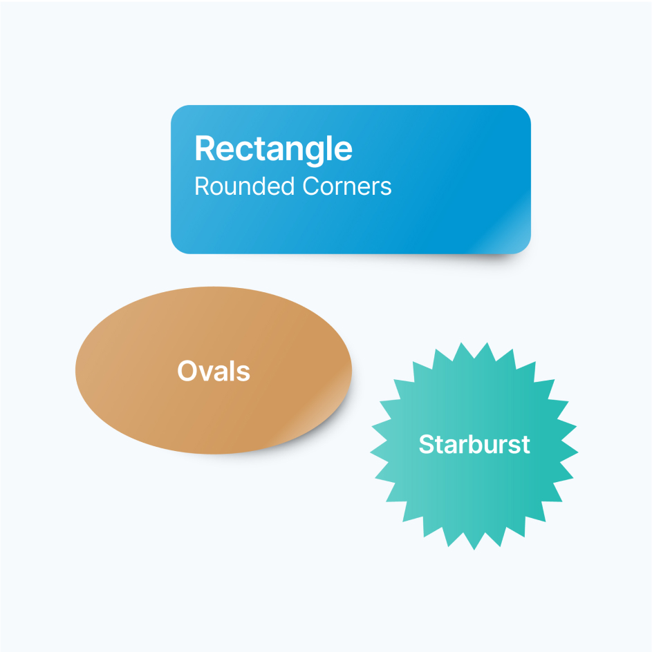 1-Color Labels is the only section you will find our sunburst and starburst shapes, along with 31 of the original sizes and shapes that started it all. Need a shape or size not listed? Simply go to the shape you need in the Shop section to see additional sizes and shapes.
